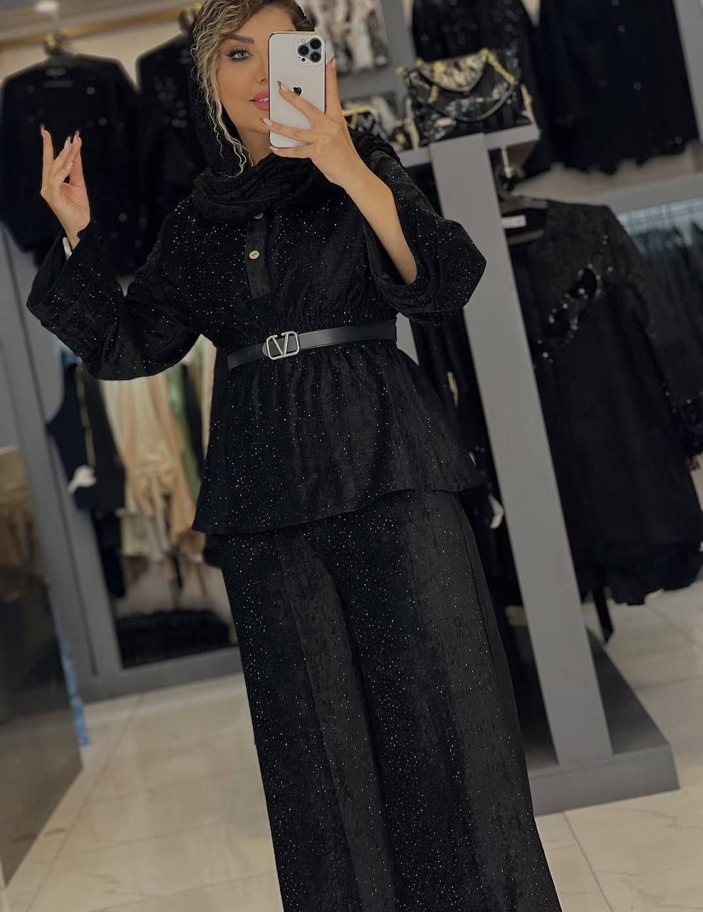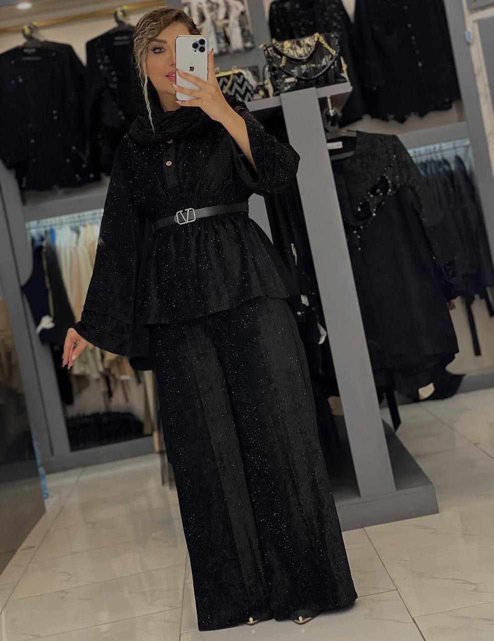 👖🧥 ست مخمل تمام نگین کاری شده 💫کاری جدید ✂️سایز فری🟩(مناسب(36تا 46_48 📊 رنگ بندی : مشکی 🎊جنس پارچه: مخمل درجه یک نگین کاری شده ❌️بدون کمربند ❌️
