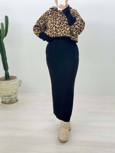 ست سارافن رویه پلنگی بافت زنانه و دخترانه ۲رنگ مشکی نسکافه ای