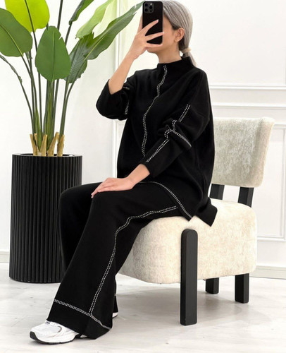 شت شومیز شلوار بگ مخمل تمام نگین کاری شده کمرکش زنانه تک رنگ مشکی و فری سایز
